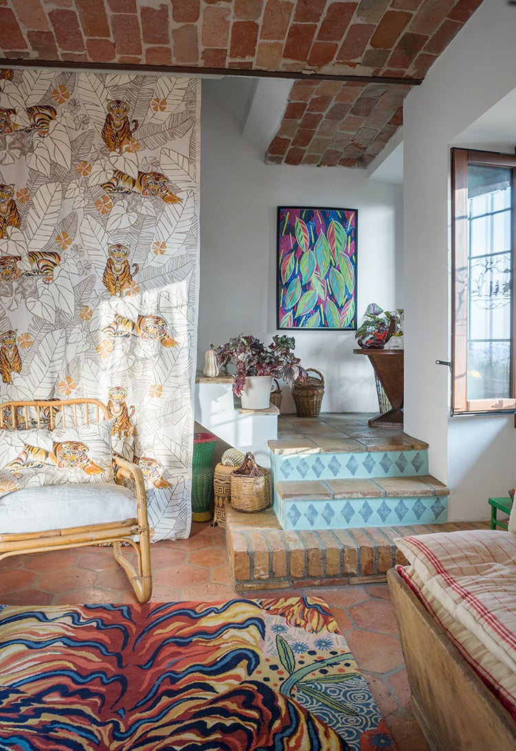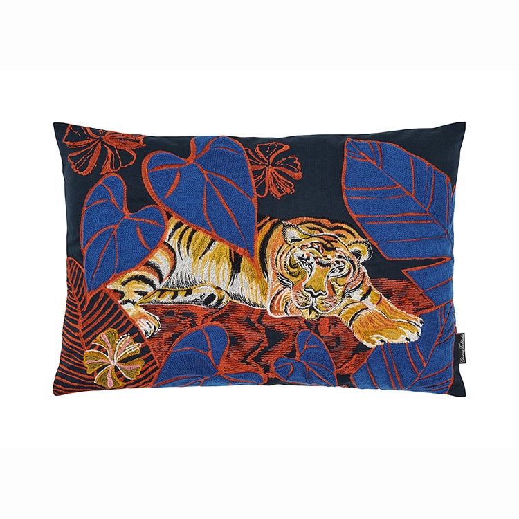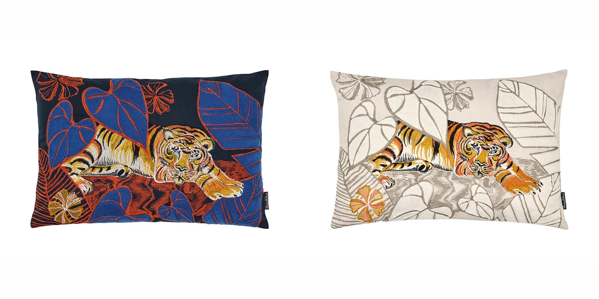 「フィスバ」の愛称で知られるクリスチャン・フィッシュバッハの新作ファブリック「DAWON(ダウォン)」。国際的に活躍するマレーシアのアーティスト、レベッカ・ダケット=ウィルキンソンが野生動物保護の観点から描いた虎を、美しい刺繍などで表現しました。カーテンに適した光沢のあるリネンとコットンの混紡生地の上に、マラヤタイガーやトロピカルなバナナの葉や花々が、緻密な刺繍で色鮮やかに描かれています。