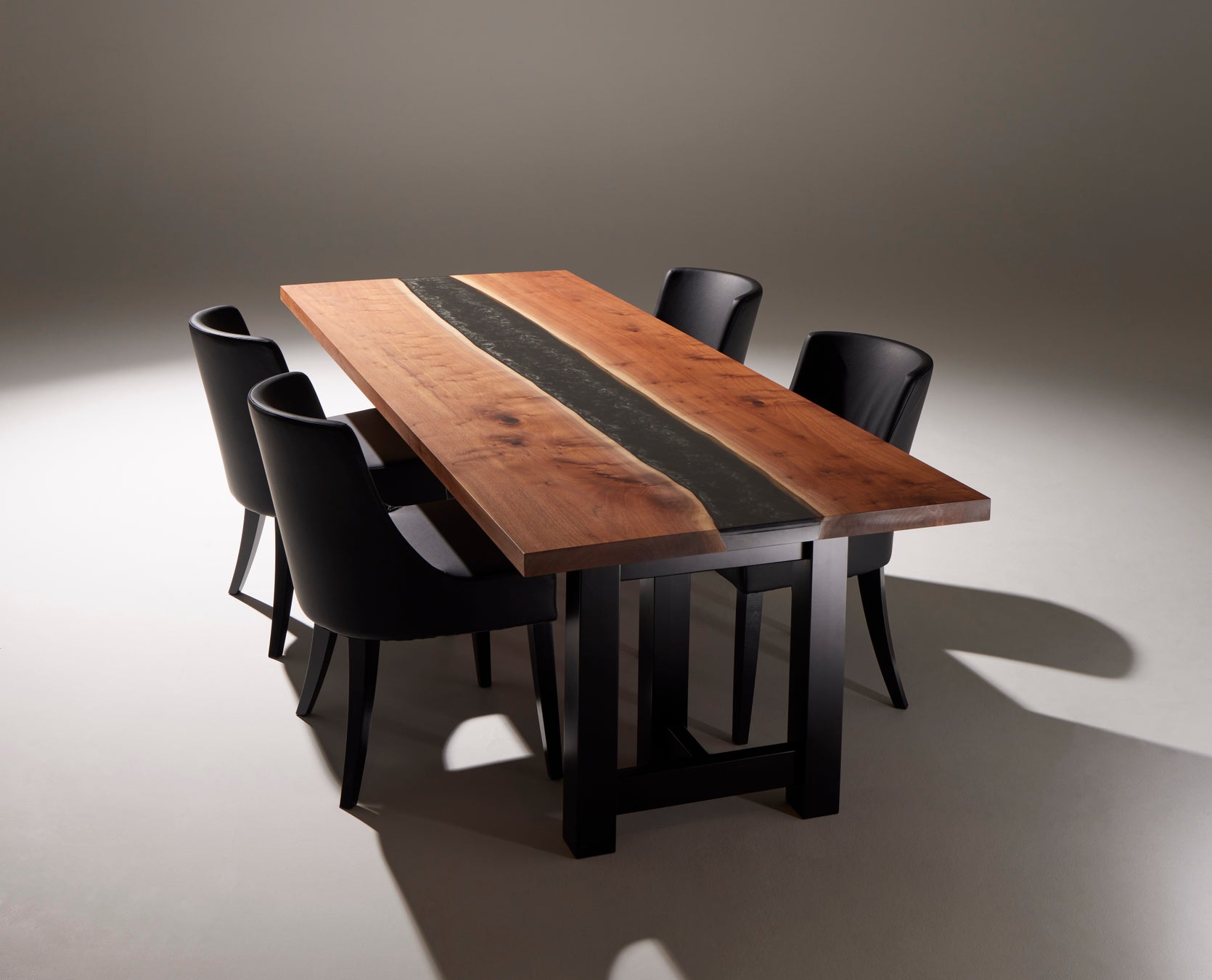 銘木の一枚板と植物由来のレジン(樹脂)を組み合わせた唯一無二のアートのような天板。一枚板の間にレジンを流し込む加工を施したものは、木部を陸地に、レジンを川に見立てて、“リバーテーブル”と呼ばれ、世界的に大きなムーブメントとなっています。