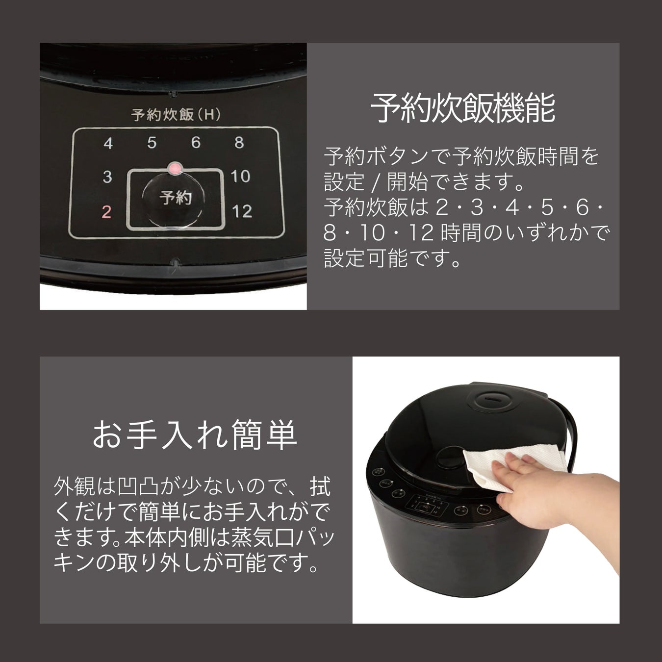 2/3/4/6/8/10/12時間より選んで予約炊飯が可能。