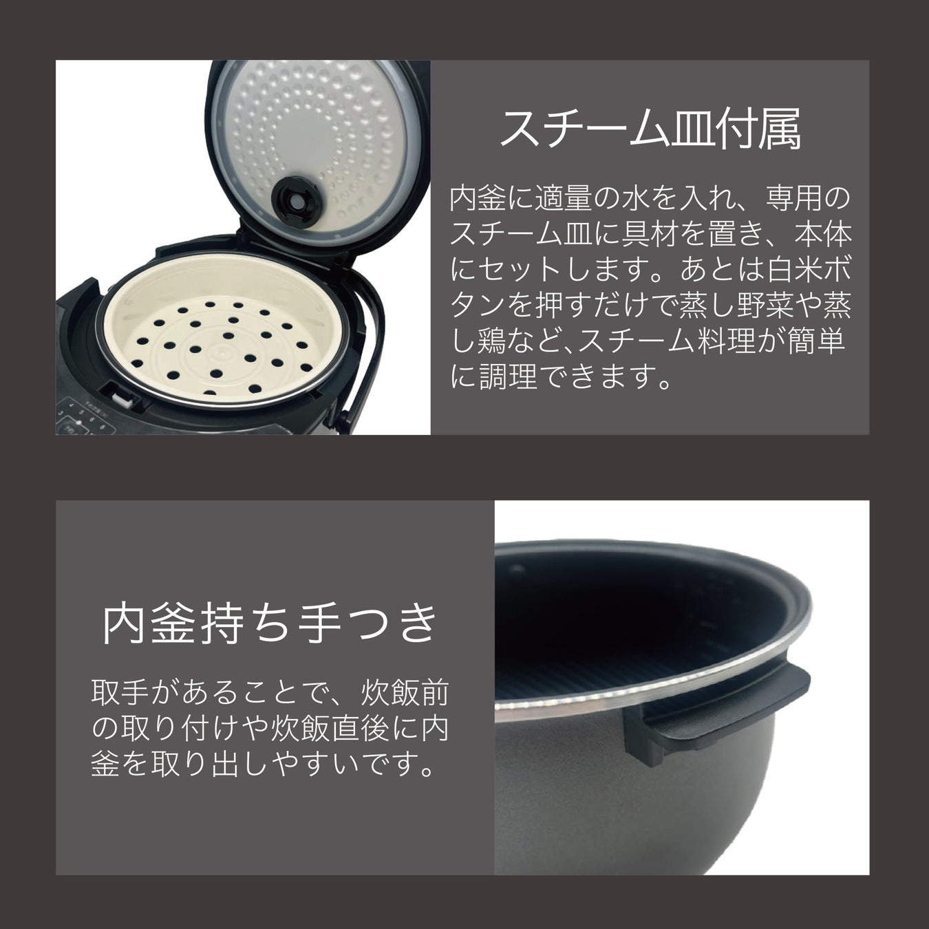 取っ手があることで、炊飯時の取付取り外しもラクラクです。