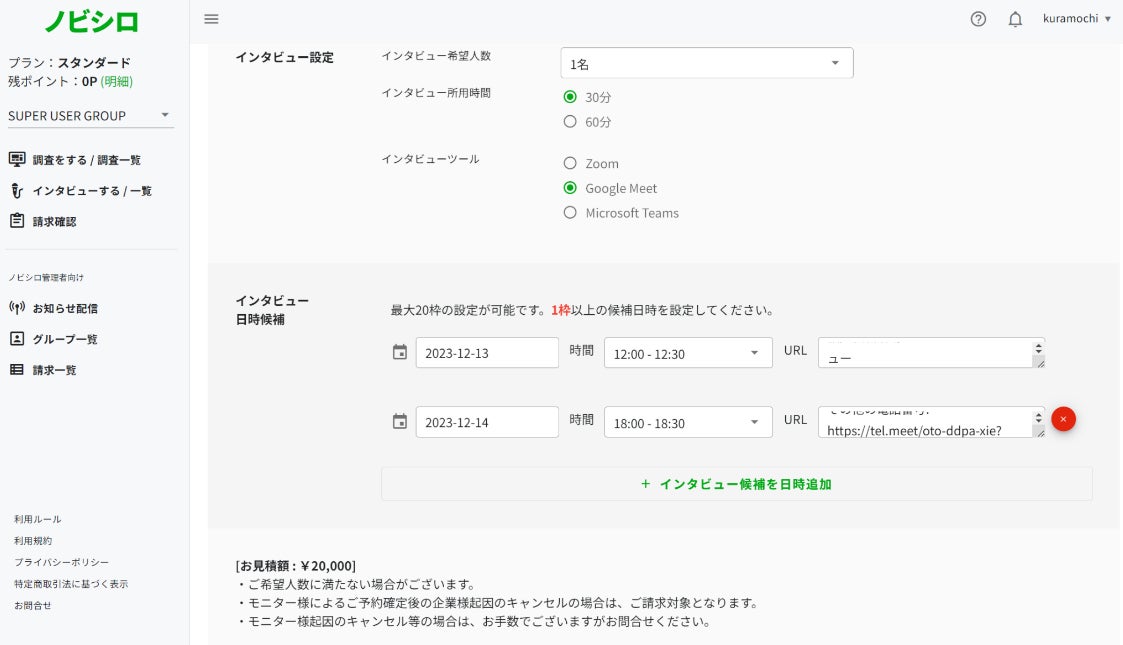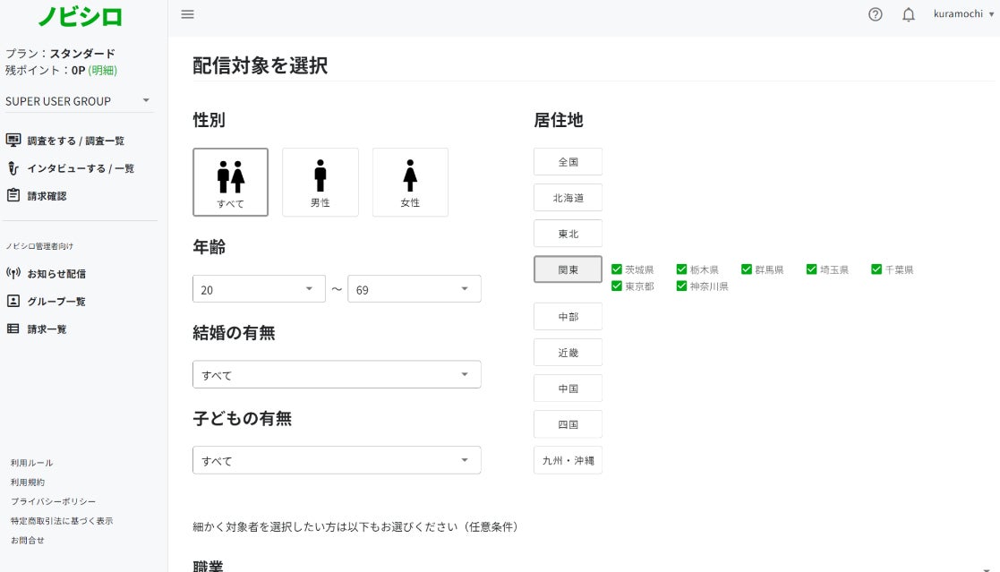 ノビシロの定性インタビュー調査は、インタビューしたいターゲット像を入力するだけで、自動で対象者を検索し、最短わずか20分でインタビューを開始することが可能になります。