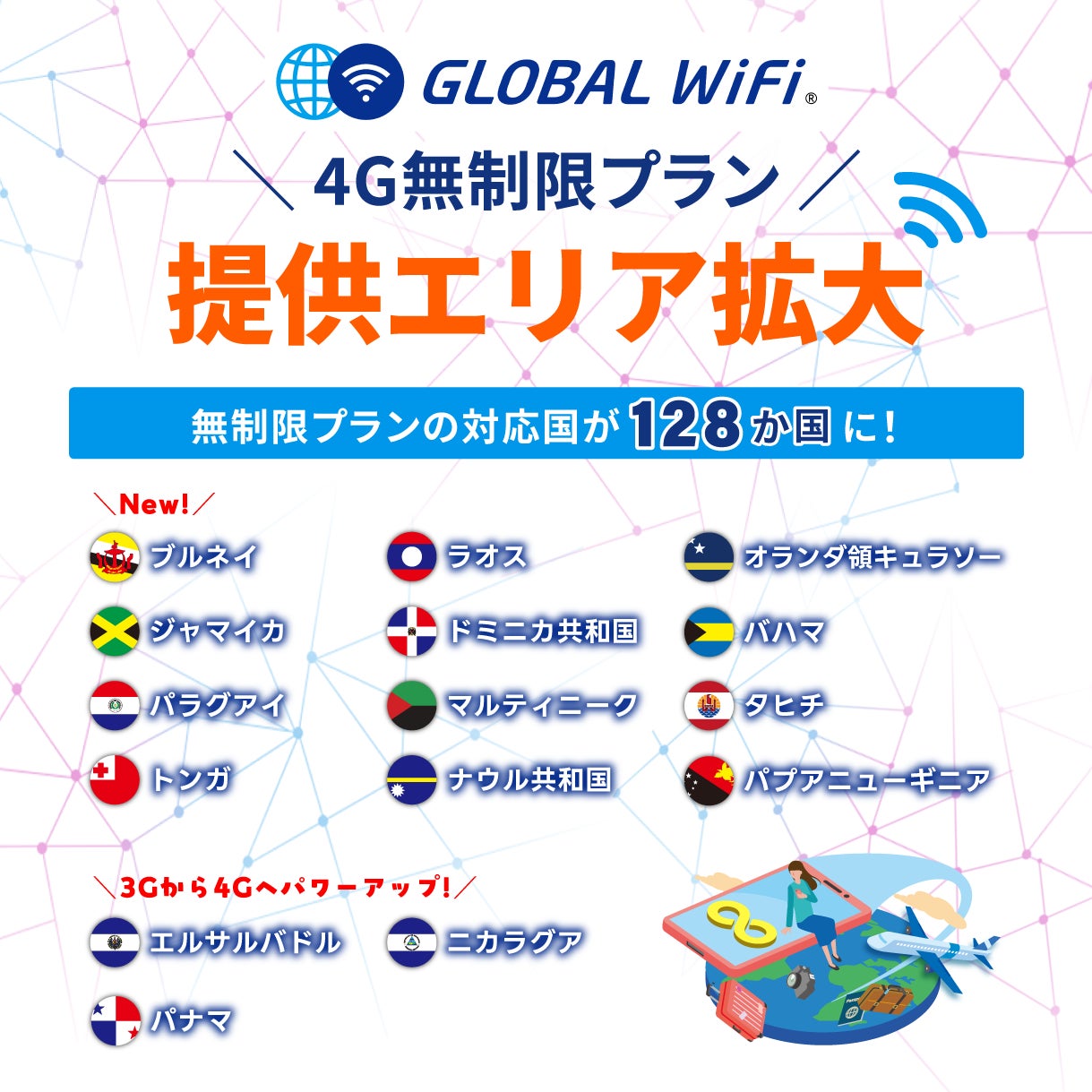 「グローバルWiFi®」データ通信容量を気にせず使える「無制限プラン」の提供エリアを128の国と地域に拡大。