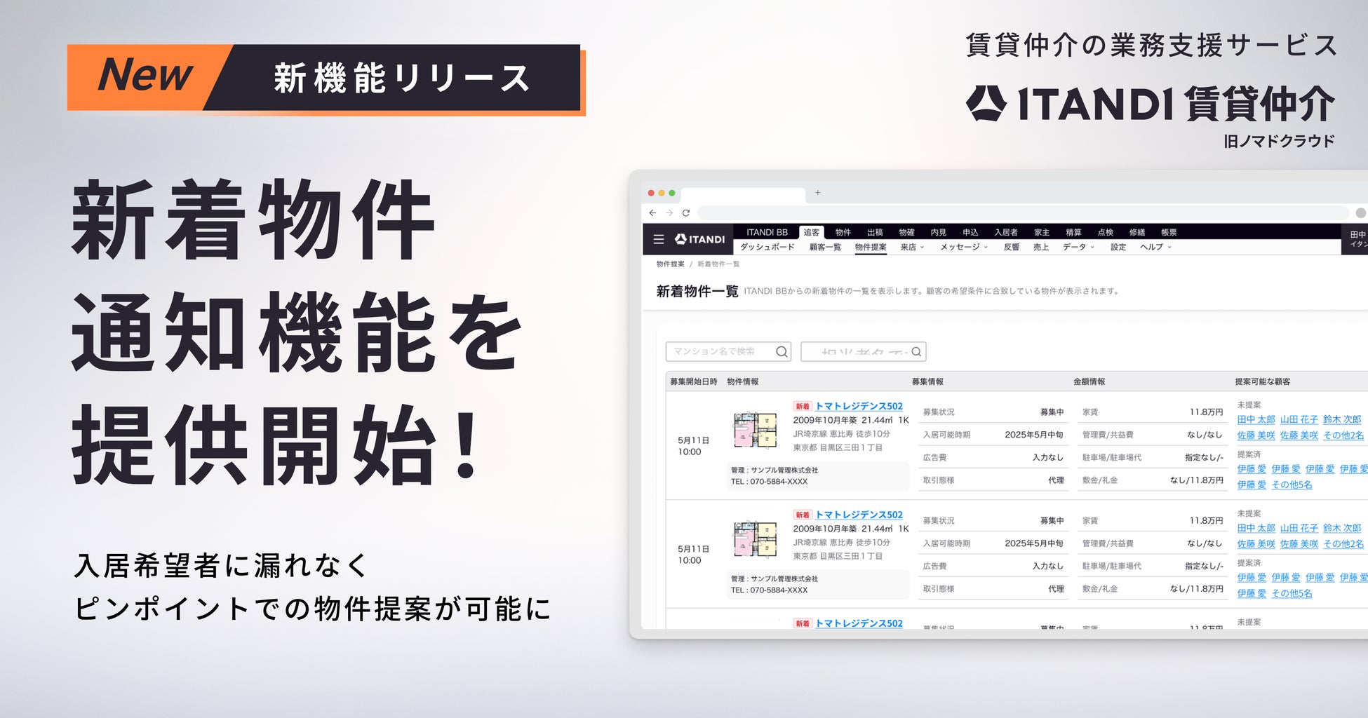 テクノロジーで不動産取引をなめらかにするイタンジ株式会社(以下「当社」)は、2025年12月より、当社が提供する賃貸仲介の業務支援サービス「ITANDI 賃貸仲介」において、リアルタイム不動産業者間サイト「ITANDI BB」に掲載された新着物件が、あらかじめ登録された入居希望者の条件と一致している場合、新着物件一覧画面に物件と該当の入居希望者の名前が表示されるようになりました。