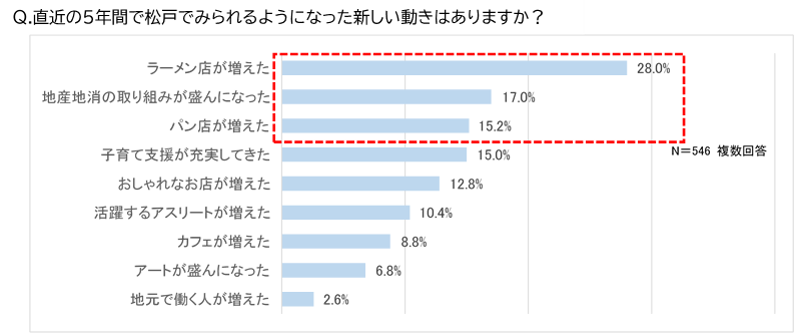 直近の5年間での松戸の新しい動きについての設問では、ラーメン店やパン店、カフェやおしゃれなお店といった新店が増加してきている様子がわかりました。松戸に新しいお店がオープンしているのは、都心から近いベッドタウンという他、松戸市民が感じている「新しいものを受け入れやすい」気質とも関係しているのかもしれません。また、地産地消の取り組みや子育て支援の充実などを挙げる人も多くいました。様々な面で「新しい松戸」を実感しているようです。