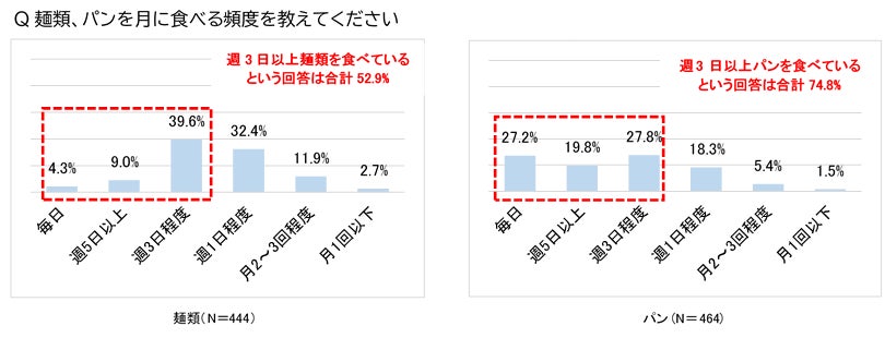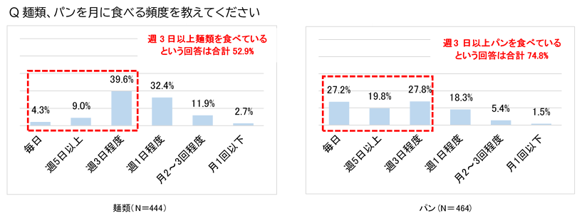 ■週に3日以上麺類を食べると回答52.9%、パンは74.8%。松戸市民の生活に根ざしている麺類・パン