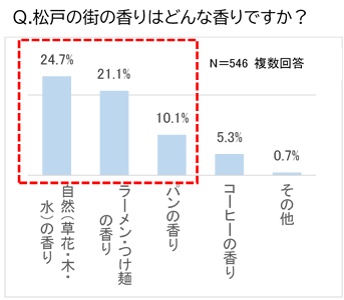 ■松戸の香りといえば「自然」、「ラーメン・つけ麺」がツートップ松戸の街の香りについての設問では、「自然」の香りが24.7%、次いで「ラーメン」が21.1%でした。松戸市は都心から20km圏内にありながら、公園をはじめ緑が多く、県境を流れる江戸川河川敷にも自然がたくさん残っています。松戸市民にとって花や木、水の香りは身近な存在と言えそうです。また、市内にラーメン・つけ麺店が多くあるため、街を歩くとスープの香りが感じられるのも、松戸市ならではかもしれません。