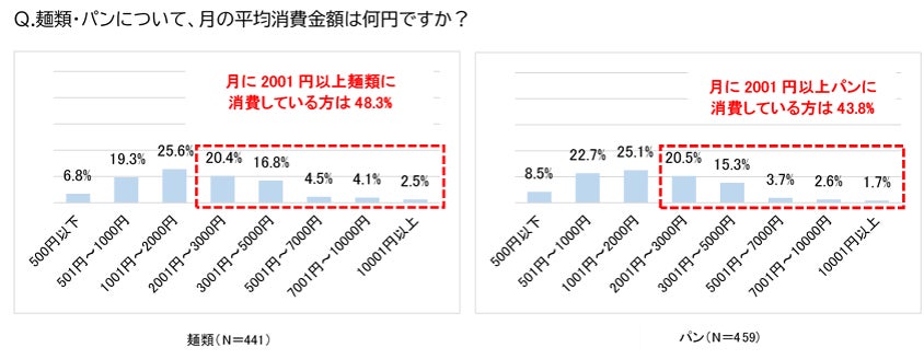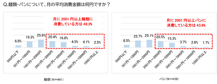 ■麺類やパンに月に2001円以上消費している人が50%近くも。麺類は全国平均※2超えも