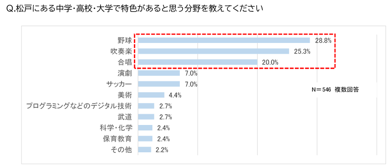 松戸市の生活や市民の意識についての設問では、松戸市の住環境や生活がしやすい様子などが見えてきました。スポーツでは高校野球で甲子園出場も果たす強豪校や、音楽分野では合唱や吹奏楽の大会で上位に食い込む学校なども松戸市民にはしっかり認知を受けており、自慢のひとつと言えそうです。