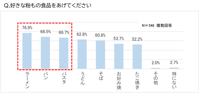 好きな粉もの食品は、ラーメンが76.9%、次いでパンが68.5%という結果になりました。パスタ、うどん、そばと続きます。全体的に高い数値で松戸市民の「粉もの」好きがあらわれています。