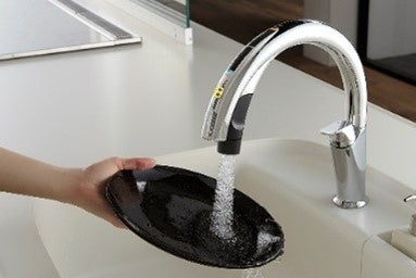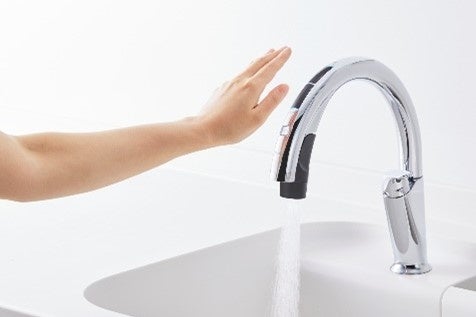 操作は吐水先端のセンターに手をかざすだけ。汚れた手でも触れずにラクラク操作できます。また、操作時に検知音が出るタイプでは、耳でも操作を確認できます。