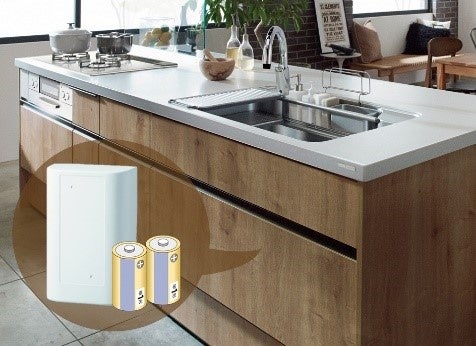 電源がなくても設置可能な乾電池式タイプも。電池ボックスがコンパクトなので場所を選ばず、アルカリ乾電池単1形2本で電池寿命は約1年です。電気工事が不要なのでタッチレス水栓をあきらめていた方にもおすすめです。