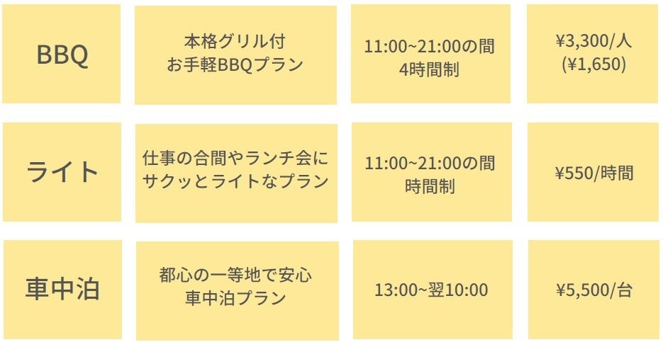 ◎より気軽にアウトドアの雰囲気をお楽しみいただける新プラン、時間制料金プラン『ライトプラン』をリリースいたします。ランチタイムや外出の合間、仕事終わりのちょっとした時間にサクッとご利用いただけます。
