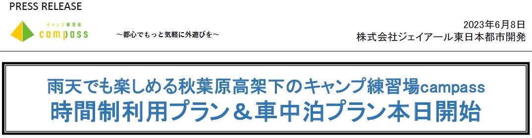 ◎㈱ジェイアール東日本都市開発は、「キャンプ練習場 campass(キャンパス)」を2023年3月19日より期間限定で、秋葉原の高架下で運営しています。本格化する梅雨時期に、雨に濡れないアウトドア体験をお楽しみください。