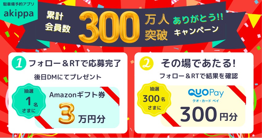 akippa公式Twitterでは、「累計会員数300万人突破 ありがとう!!キャンペーン」としてフォロー&RTキャンペーンを実施します。