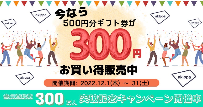 累計会員数300万人突破を記念して、会員の皆様への感謝の気持ちを込めて、12月1日より「giftee(ギフティ)」にてakippaの500円分のeギフトクーポンが300円で購入できるお得なキャンペーンや、Twitterキャンペーンを実施いたします。