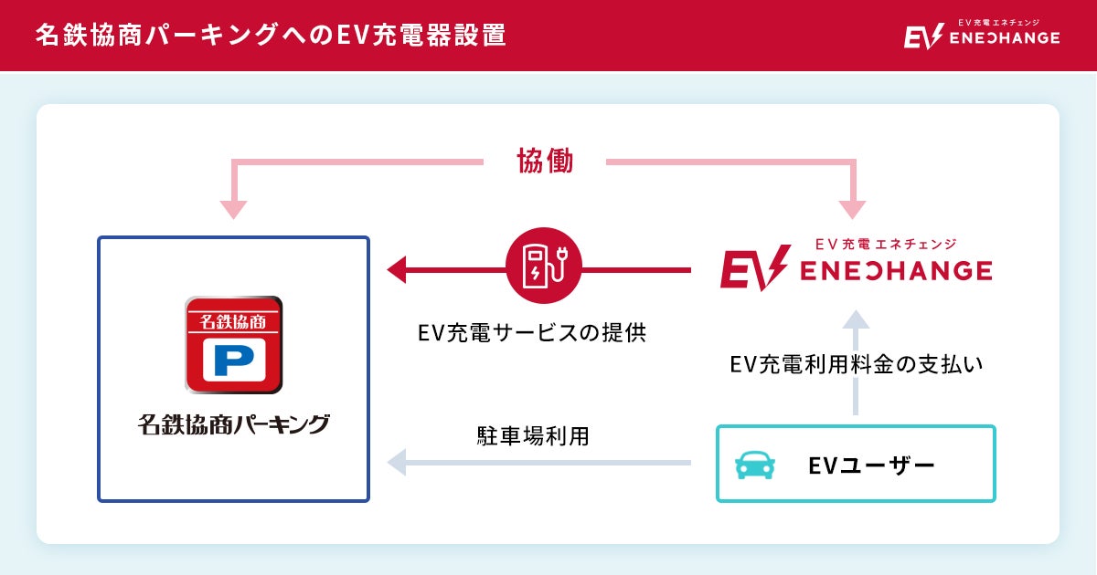 ENECHANGE(エネチェンジ)株式会社(本社:東京都中央区、代表取締役CEO:城口洋平、以下:エネチェンジ)と名鉄協商株式会社(本社:愛知県名古屋市、代表取締役:小林昌弘、以下:名鉄協商)は、愛知県内の「名鉄協商パーキング」3カ所に、6kWの普通充電器を計6口設置し、サービス連携を始めたことをお知らせします。今後も両社は、EV普及台数全国2位(※)のEV先進県である愛知県を中心に充電インフラを拡充し、脱炭素社会の実現に向けた電動車の普及に貢献してまいります。