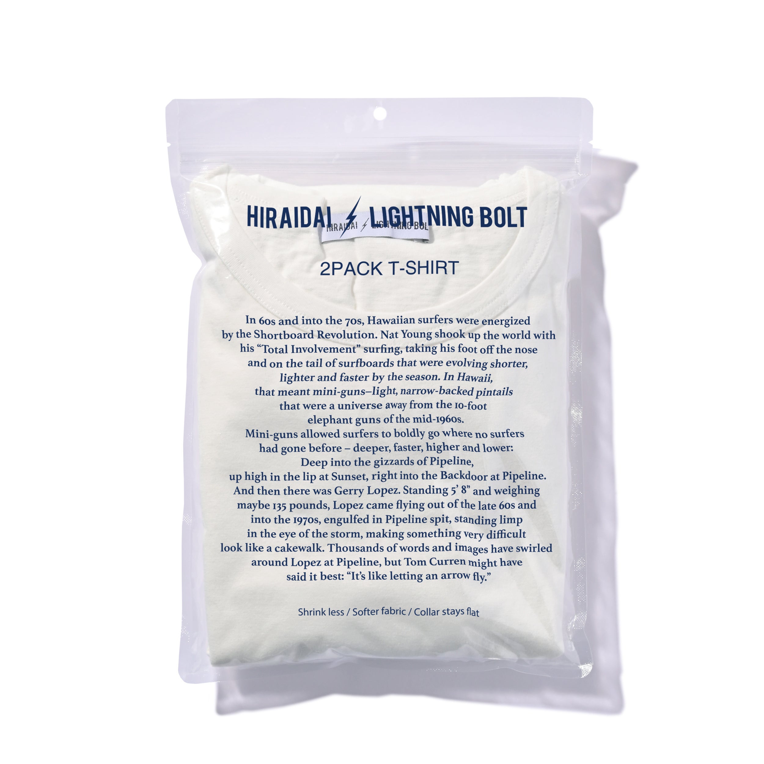 1960年代、ハワイ。レジェンドサーファー ジェリー・ロペスとその仲間たちが、彼らのシンボルマークとして“稲妻マーク”を自身のサーフボードにつけて使い始めた。それをきっかけとして1971年、サーフブランド「LIGHTNING BOLT」が誕生。ジェリー・ロペスの活躍とともに、アイテムやライフスタイルが多くのサーファーたちを魅了していくなか、サーフィンを題材としたハリウッド映画「BIG WEDNESDAY(1978年公開、ジェリー・ロペス出演)」が大ヒット。映画ヒットの追い風を受け、世界的なブランドに成長した。