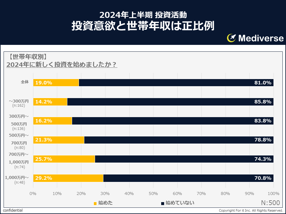 今回のアンケート調査結果では、2024年上半期に新しく投資を始めたのは2割程度に留まっており、その投資活動には、性別・年代・世帯年収がいずれも大きく影響していることが判明いたしました。