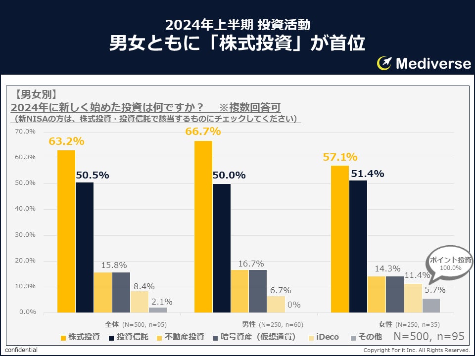 男女別に見ると、2024年上半期に新しく始めた投資手法は、男女ともに1位「株式投資」2位「投資信託」3位「不動産投資」「暗号資産(仮想通貨)」であったものの、それぞれの割合にはジェンダー差が見受けられた。