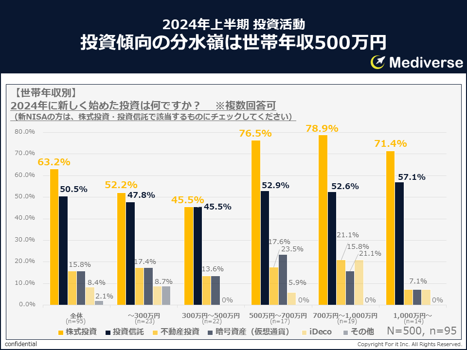 世帯年収別に見ると、2024年上半期に新しく始めた投資手法のうち、世帯年収500万円を分水嶺として、異なる傾向が見られた。