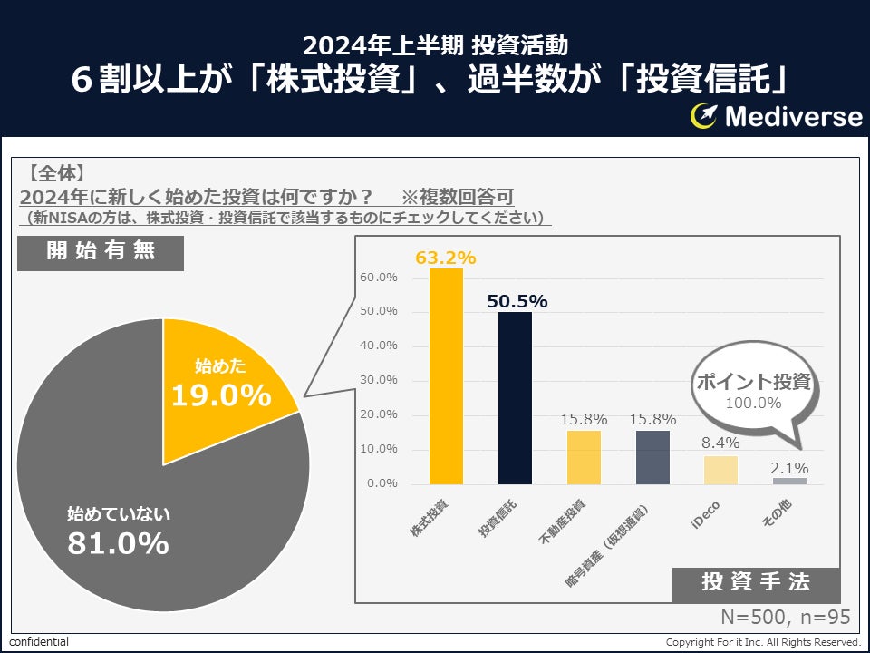 「2024年上半期に新しく投資を始めた」と回答した19.0%に対して、その投資手法を聞いてみると、もっとも多かったのは「株式投資」63.2%、その後、2位に「投資信託」50.5%、3位に「不動産投資」および「暗号資産(仮想通貨)」が同率15.8%と続いた。