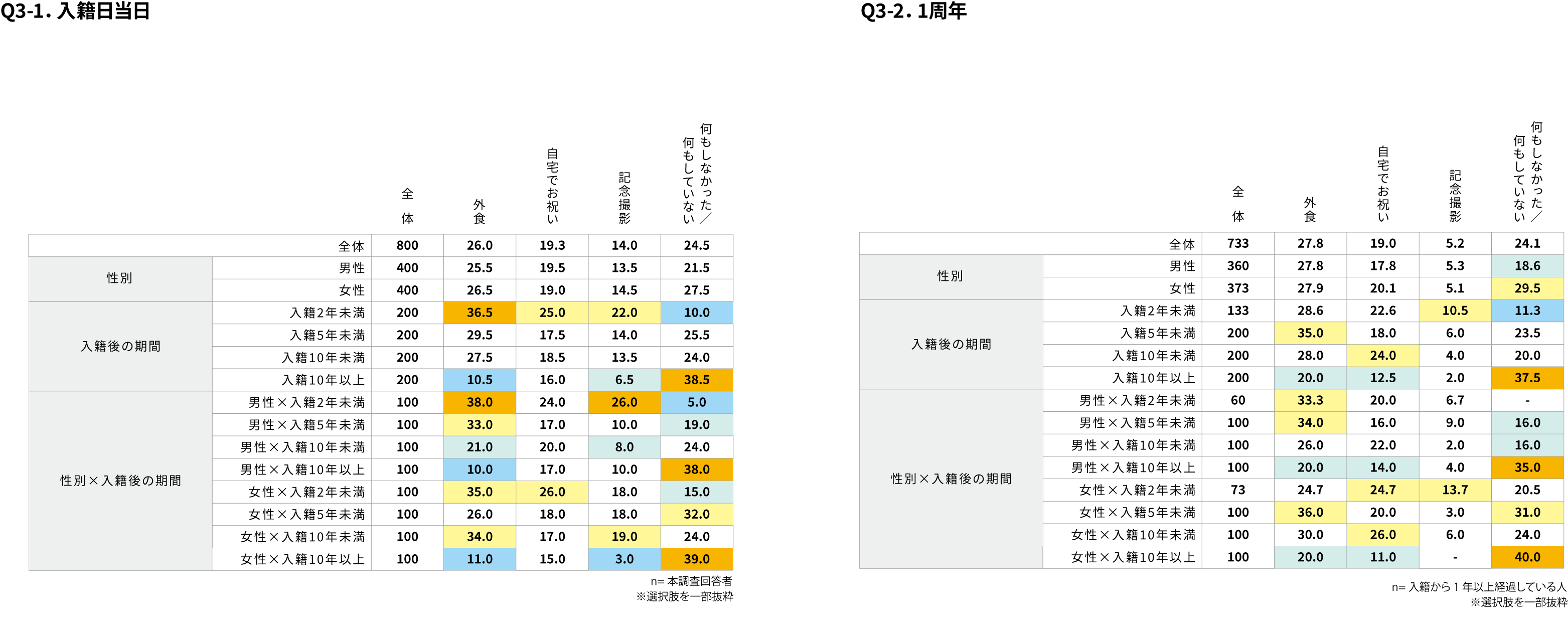 Q.入籍記念日に実施するお祝い事について、当てはまるものを全てお知らせください。入籍後の経過期間に合わせて、お答えできる期間について回答ください。(それぞれ複数選択可)