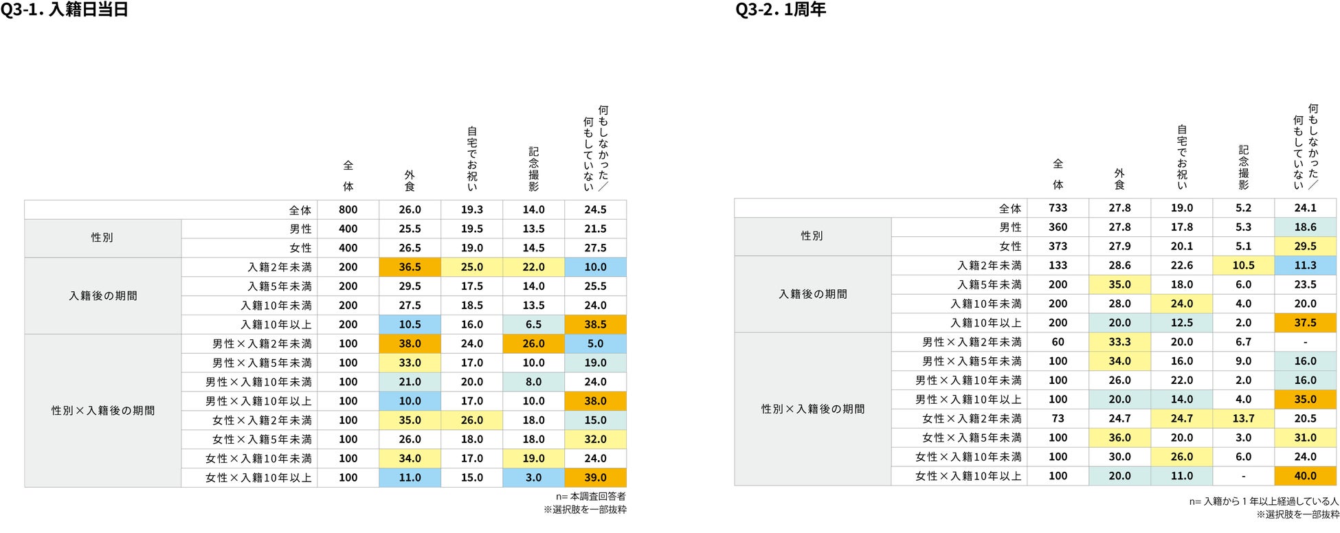 【1周年】では、順位に変化はないが、入籍後の期間別、性別×入籍後の期間別でみた際に、際立って高い項目も見当たらない。