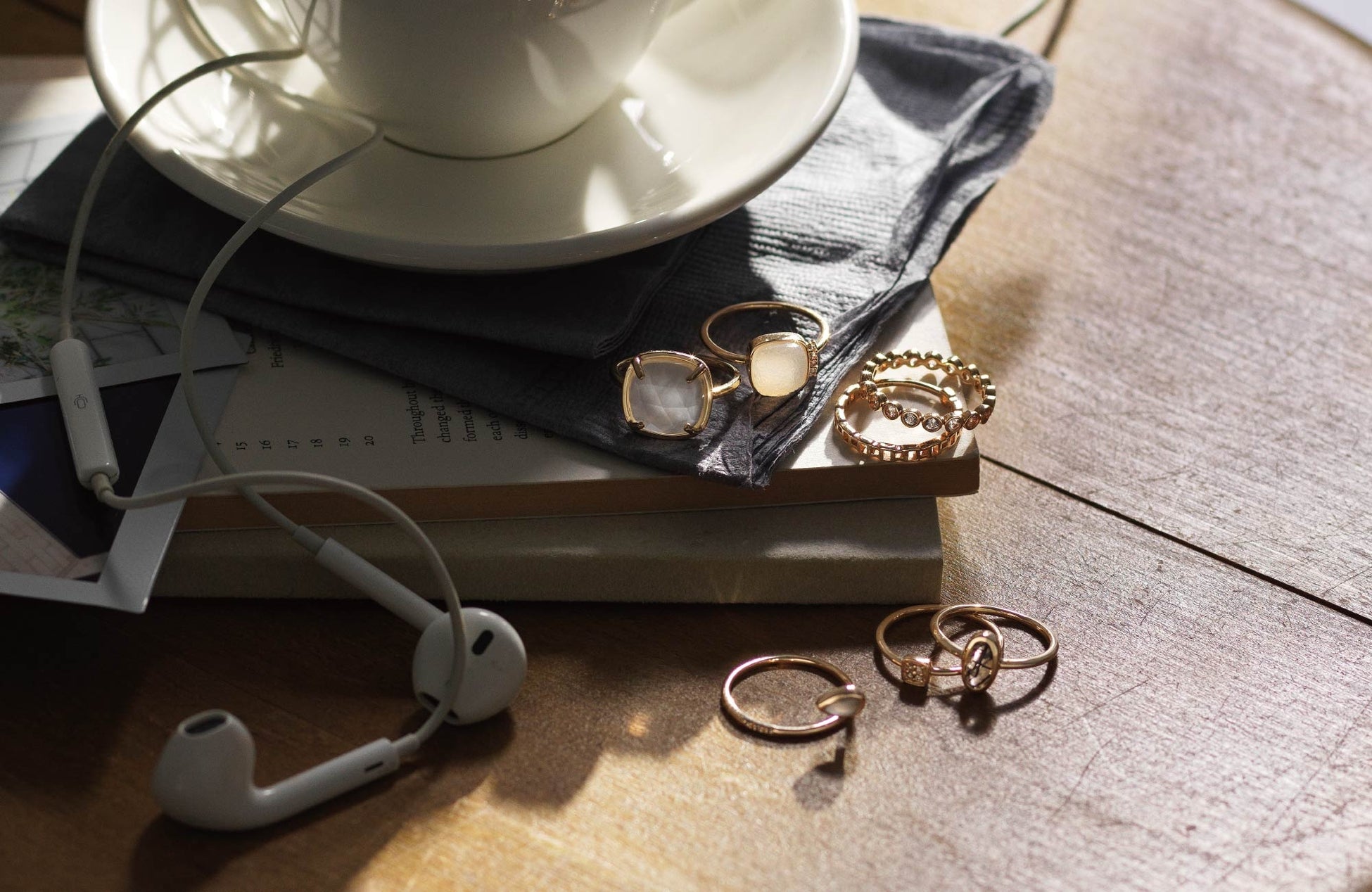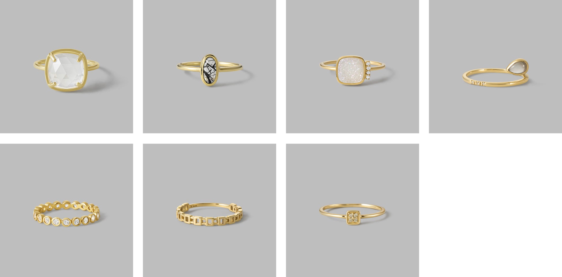 今回のリングコレクションは、「The Tidal」らしいモードな春ファッションにぴったりのカラーストーンを取り入れたデザインが特徴です。ホワイトクォーツ、ブラックルチルクォーツ、ドルジーアゲート、グレームーンストーンの4種類の天然石を、それぞれの魅力が最大限引き立つフォルムとカットで仕上げました。爽やかさと大人らしさを兼ね備えたこれらのリングは、指先に華やぎを添えます。