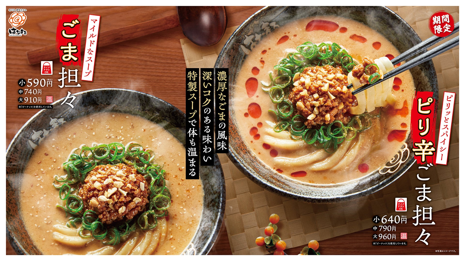 讃岐うどんチェーン「はなまるうどん」を展開する株式会社はなまる(本社:東京都中央区 代表取締役社長:前田良博、以下はなまる)は、2024年12月15日(日)より、全国(※一部店舗除く)のはなまるうどんにて、「ピリ辛ごま担々」「ごま担々」を期間限定販売いたします。