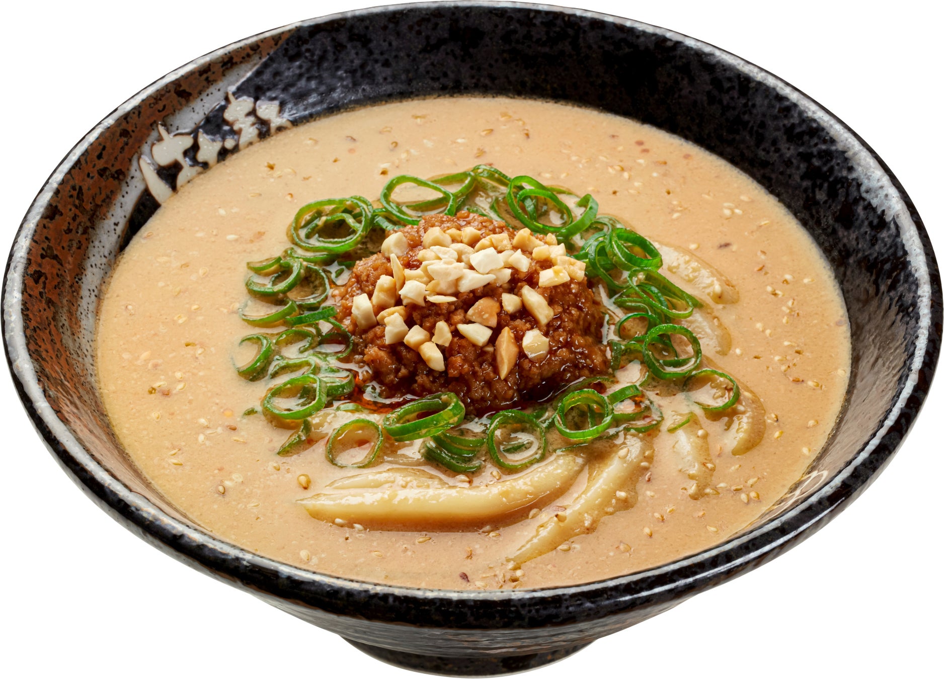 「ごま担々」は、白ごまのおいしさをストレートに味わっていただけるうどんです。濃厚でクリーミー、マイルドなスープは、温かいふわっとした讃岐うどんとの相性もよく、喉ごし良くツルツルと召し上がっていただけます。