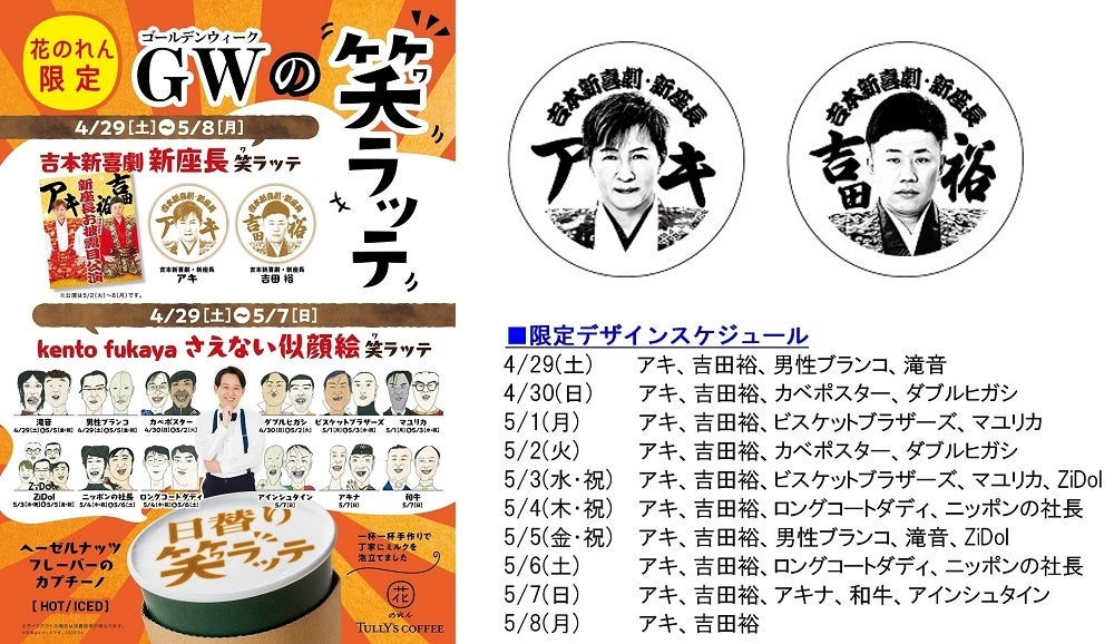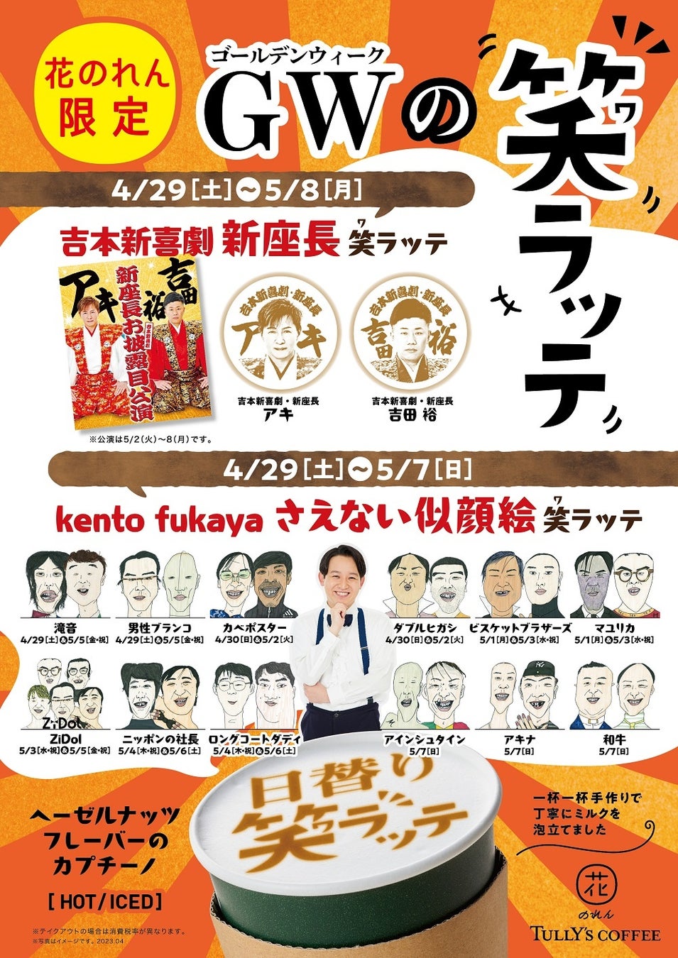 よしもと×タリーズ 「花のれんタリーズコーヒー なんばグランド花月店」吉本新喜劇・新座長や『kento fukaya』のさえない似顔絵デザインの日替わりエスプレッソビバレッジ