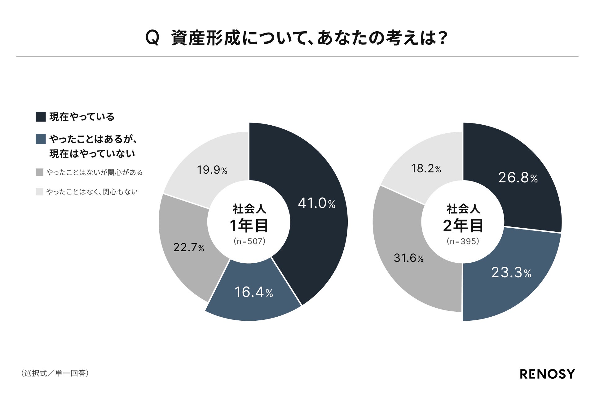 社会人1年目と2年目にそれぞれ「資産形成について、あなたの考えは?」と尋ねたところ、社会人1年目の資産形成経験者(現在やっている+やったことはあるが、現在はやっていない)は57.4%、社会人2年目の資産形成経験者は50.1%であることがわかりました。