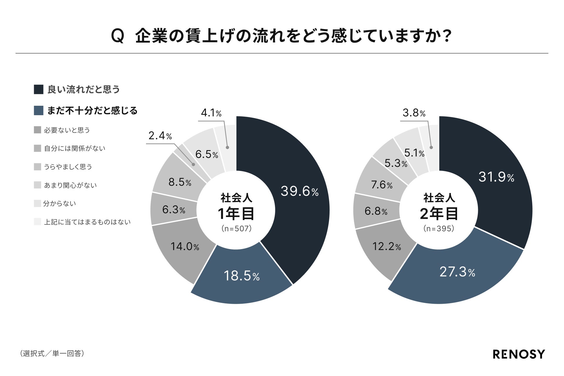 社会人1年目と2年目にそれぞれ「企業の賃上げの流れについてどう感じているか?」と尋ねたところ、社会人1年目は39.6%、社会人2年目は31.9%が「良い流れだと思う」と回答し、選択肢のうち最も回答率の高い結果となりました。