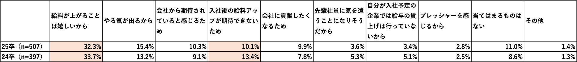 一方で選択肢の「入社後の給料アップが期待できないため」は、4番目に多く回答(社会人1年目:10.1%/社会人2年目:13.4%)があり、社会人2年目の方が3.3ポイント回答率が高くなっています。社会人2年目が「企業の賃上げに対し不十分だと思う」とする背景には、「給与アップが期待できない」ことにあると考えられます。