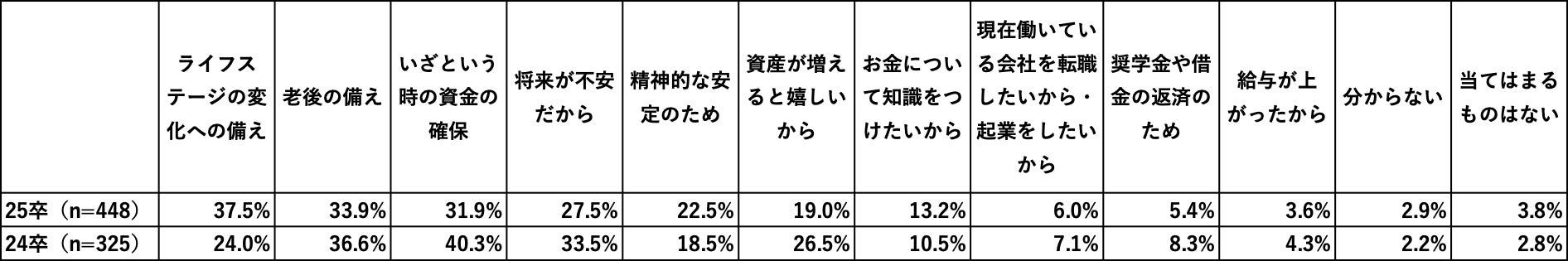 最後に、社会人1年目・社会人2年目に「資産形成をする・したい理由は?」と質問しました。社会人1年目は「ライフステージの変化への備え」(37.5%)、社会人2年目は「いざという時の資金の確保」(40.3%)が最も多い回答となりました。次点では「老後の備え」(社会人1年目:33.9%/社会人2年目:36.6%)が多く、将来のために目的を持って資産形成を行っていることがわかります。
