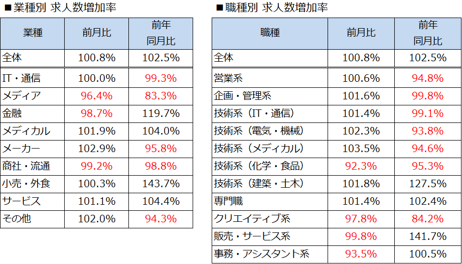 2020年3月の転職求人倍率は、前月比+0.02ポイントの2.54倍となりました。求人数は前月比100.8%、前年同月比102.5%となりました。転職希望者数は前月比100.4%、前年同月比106.1%でした。業種別では、「その他」を除く8業種のうち「IT・通信」「メディカル」「メーカー」「小売・外食」「サービス」の5業種で求人数が増加しました。求人の増加率が特に高かったのは、「メーカー」(前月比102.9%)、「メディカル」(前月比101.9%)でした。職種別では、11職種のうち「技術系(化学・食品)」「クリエイティブ系」「販売・サービス系」「事務・アシスタント系」を除く7職種で求人数が増加しました。求人の増加率が特に高かったのは、「技術系(メディカル)」(前月比103.5%)、「技術系(電気・機械)」(前月比102.3%)でした。