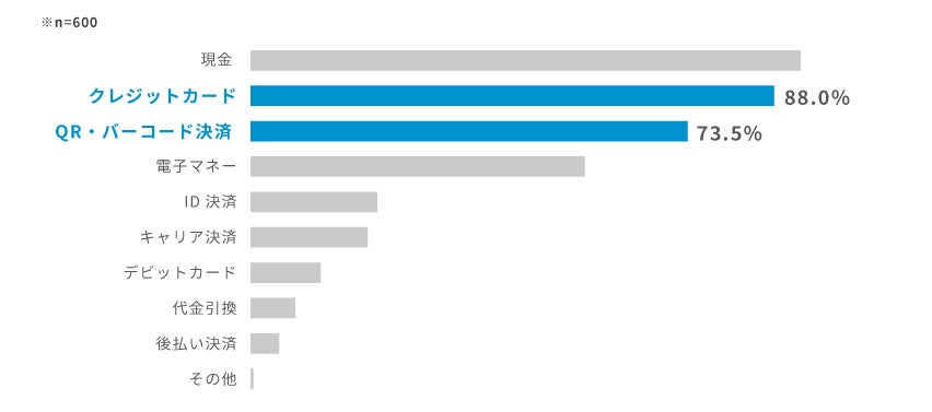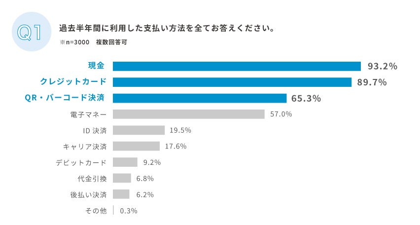 Q1, 直近半年以内に利用した決済は現金・クレジットカードが約90%を占める中、QR(※1)/バーコード決済も60%以上が利用している・直近半年で利用した決済を聞いたところ(複数回答)、1位「現金」、2位「クレジットカード」、3位「QR/バーコード決済」4位「電子マネー」となりました。