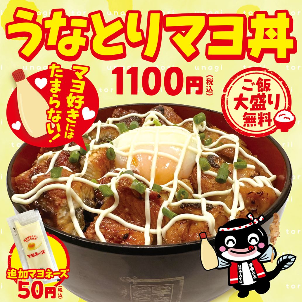 鰻と焼鳥にマヨネーズという超意外な組み合わせですが、これが相性抜群! あまじょっぱい宇奈とと特製のたれに、温泉玉子とマヨネーズがガツンとしたうま味をプラス。禁断の組み合わせが生み出す、おいしさの相乗効果をぜひご堪能ください! まだ濃厚さ、背徳さが足りないという猛者に向けて追いマヨネーズ(50円)もご用意しております。