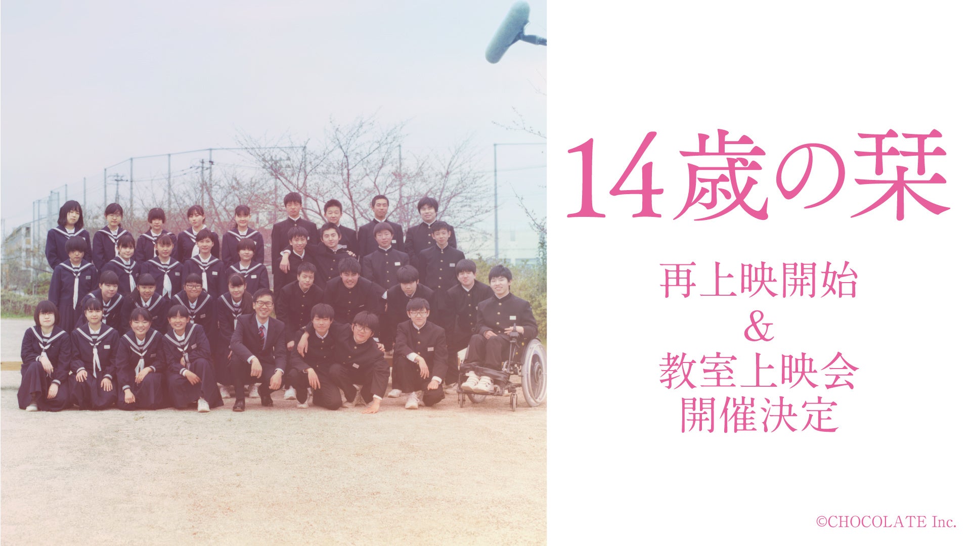 CHOCOLATE Inc. (本社:東京都渋谷区、代表取締役:渡辺裕介、以下 チョコレイト)は、弊社企画・製作による初の長編映画作品『14歳の栞』(配給:PARCO / 監督:竹林亮)の2度目となる限定再上映を、3月3日より全国にて順次開始することをお知らせいたします。とある中学校の3学期、「2年6組」に在籍する生徒35人全員に密着した本作品は、2021年3月に1館の劇場から上映を開始し、現在までに全国45ヶ所で上映を行なっている青春リアリティ映画です。2022年春の再上映を経て、3年目の春を迎える本作の上映を記念し、2月23日には初の試みとなる1日限定の“教室上映会”を、豊島区立大明小学校の廃校舎を活用した生涯学習施設「みらい館大明」(東京・池袋)にて開催いたします。