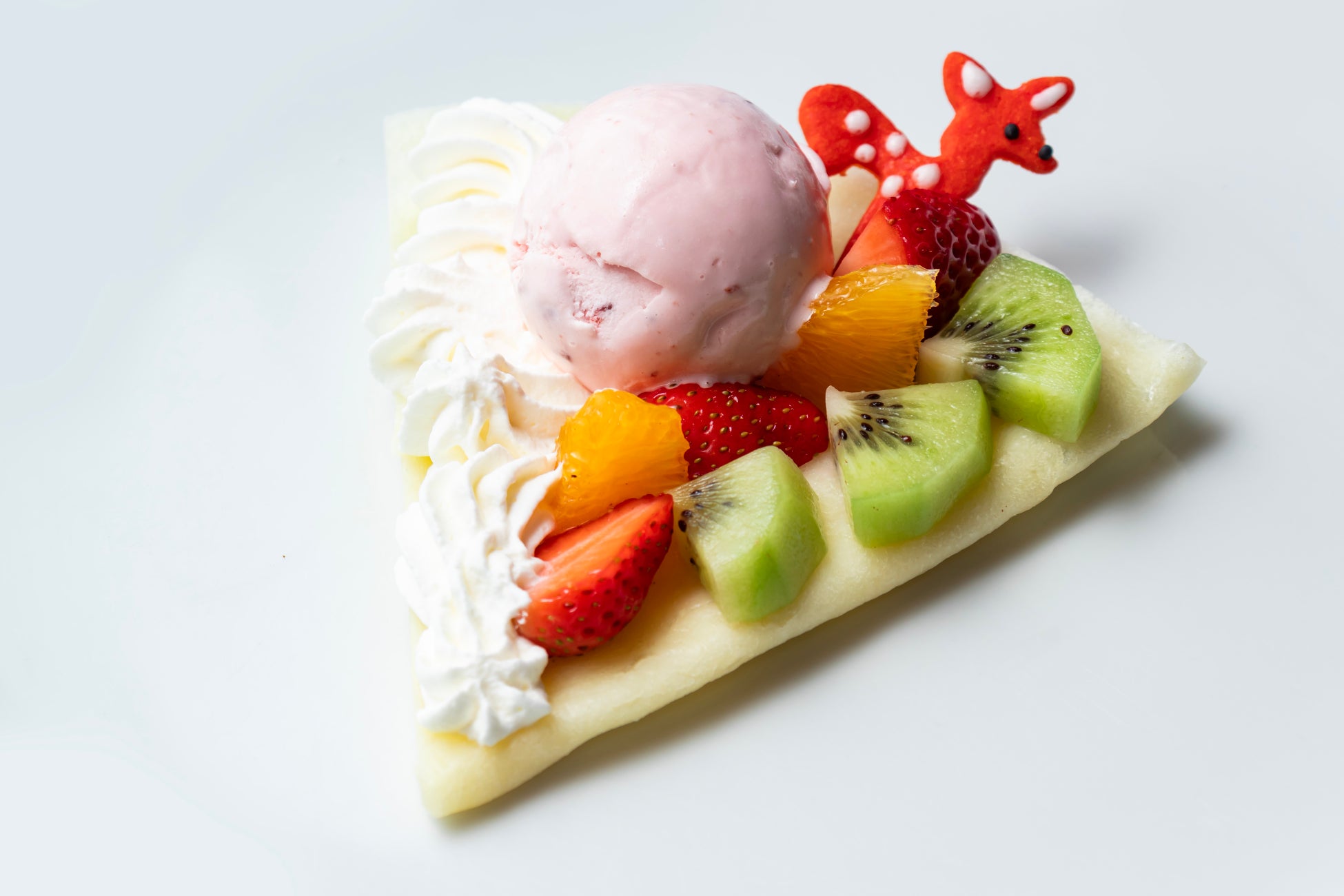 季節の県産フルーツがゴロゴロ入った、満足感のあるシグネチャークレープです。中のアイスはお好きなものを選んでいただけます。