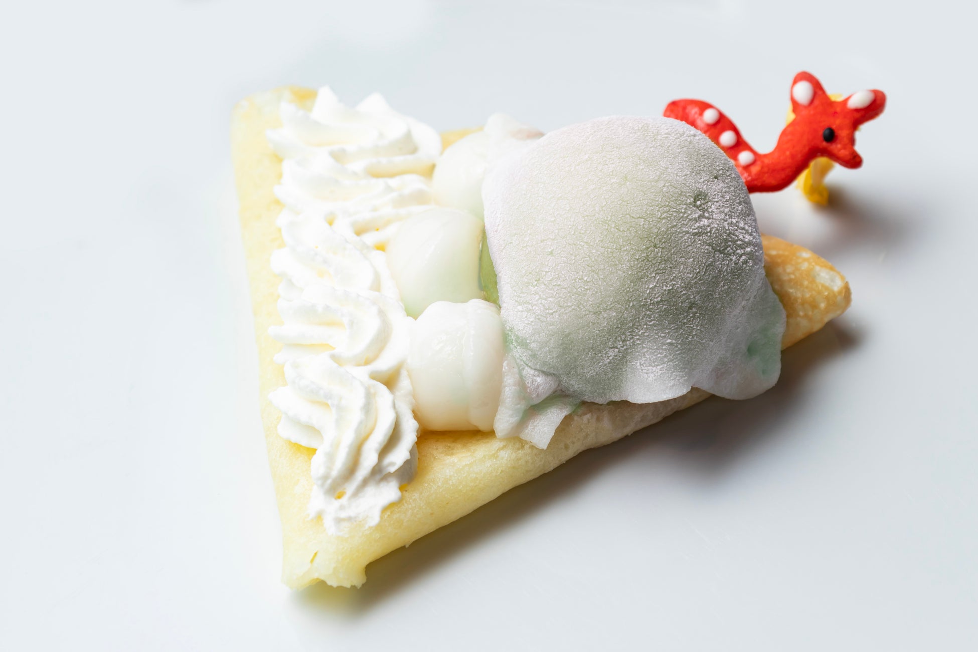 県産もち米を使った自家製の求肥で、大和抹茶アイスかほうじ茶アイスを包んだ和クレープ。その名の通り、米粉の生地・求肥・白玉のもちもち食感をお楽しみください。