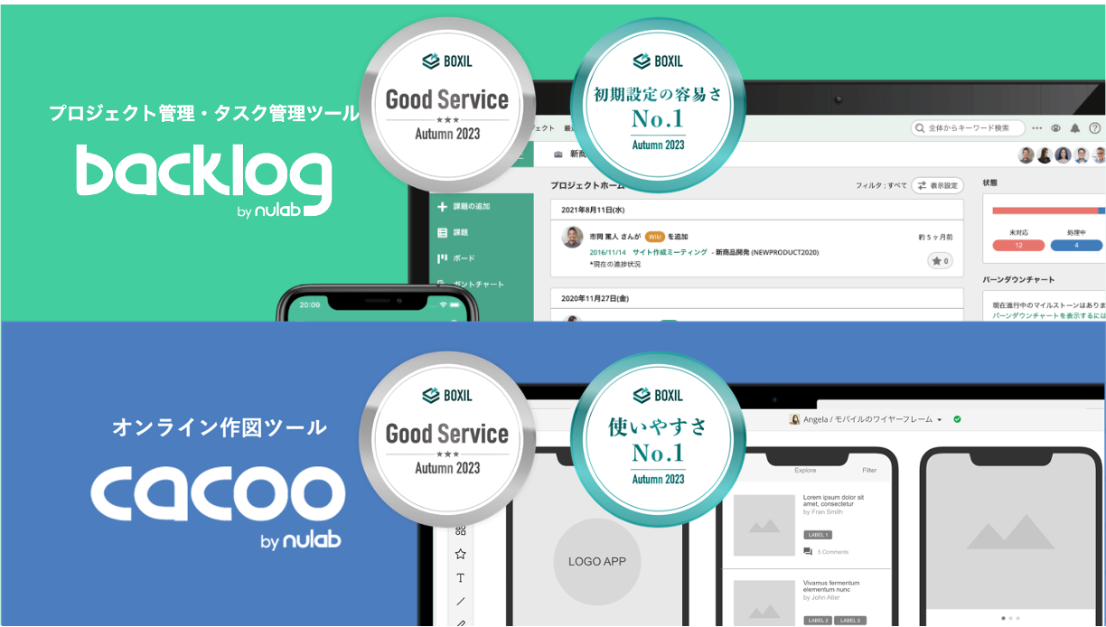 ヌーラボが提供する「Backlog」は「プロジェクト管理・工数管理部門」で、Cacooは「グループウェア部門」でそれぞれ「Good Service」に選ばれました。なお、口コミ項目別の評価として、Backlogは「初期設定の容易さNo.1」、Cacooは「使いやすさNo.1」も同時に受賞しています。