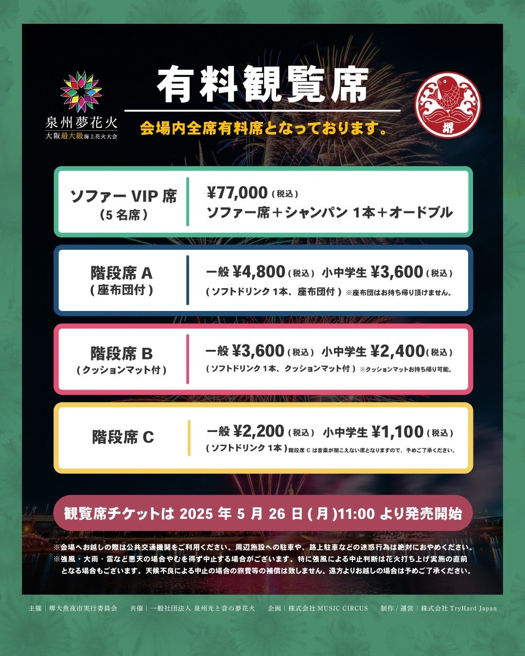 株式会社 TryHard Japan(大阪市中央区)は、2025年7月26日(土)にに、堺市大浜公園にて開催される「堺大魚夜市(さかいおおうおよいち)」とのコラボレーション企画として、「泉州夢花火 in 堺大魚夜市」の開催と、有料観覧席チケットの販売開始をお知らせいたします