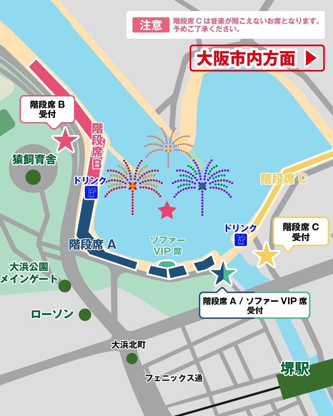 泉州夢花火 in 堺大魚夜市は全席先着順の自由席となっております。場合によっては団体様であっても離れてお座り頂く可能性がございますので、早めのご来場を推奨いたします。