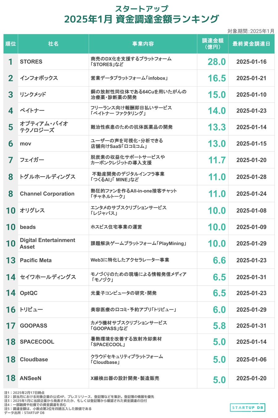 【STARTUP DB】調査結果 スタートアップ資金調達金額ランキング(2025年1月)