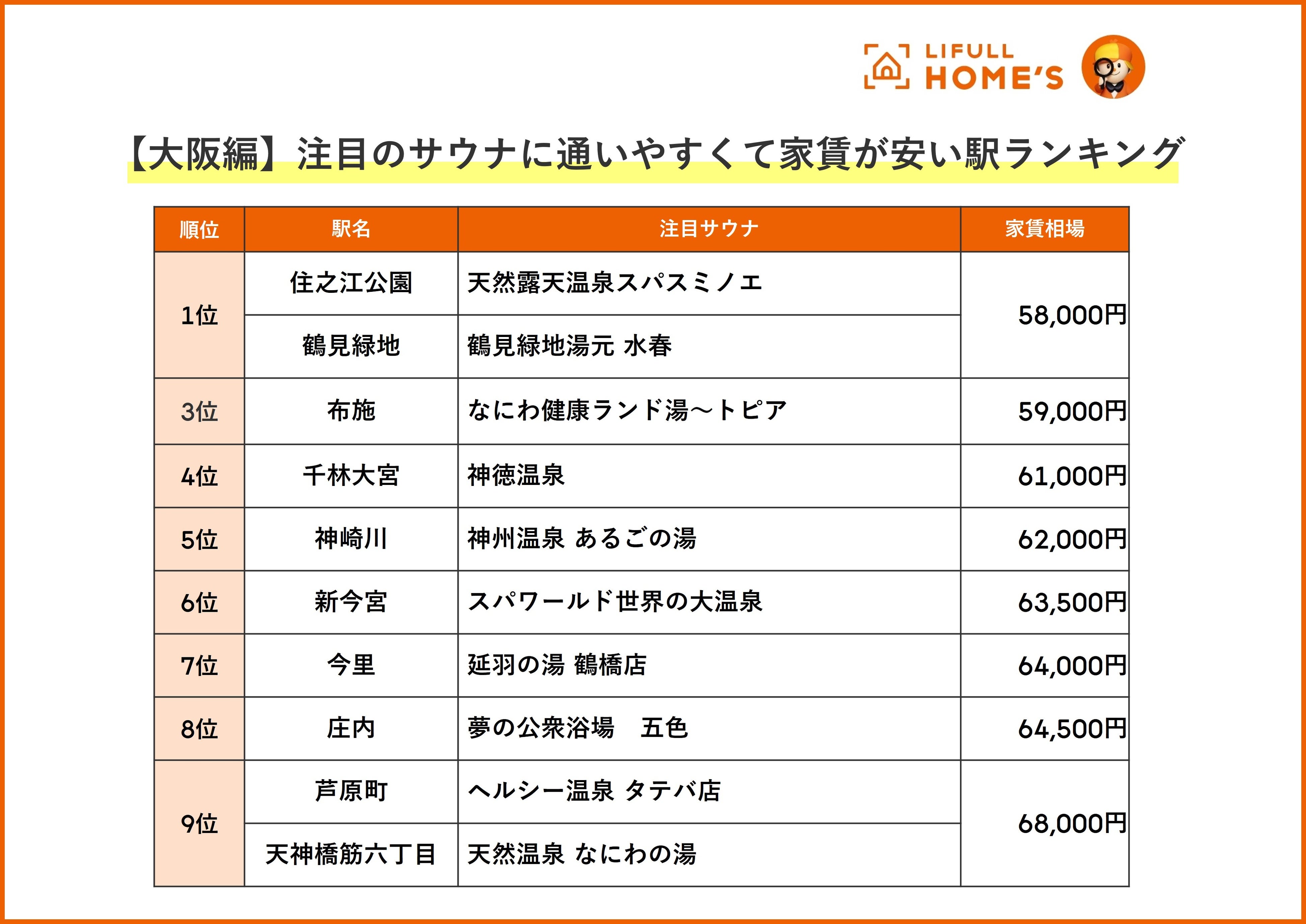 LIFULL HOME'Sが「【大阪編】注目のサウナに通いやすくて家賃が安い駅ランキング」を発表
