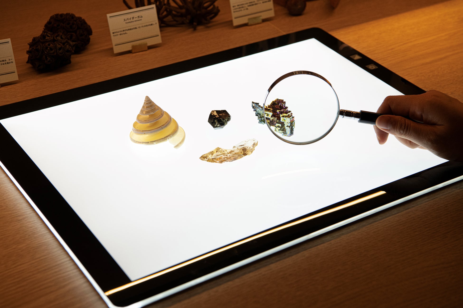 気になるものを手に取れ、近くで見れるからこそ、好奇心をくすぐることができると考えています。キャビネットの1段目、2段目にある植物、鉱物、貝類、魚類の標本は手に取って、触ることができます。また、自然界が作り上げた細かい色のグラデーションや繊細な模様、重なりなど、よく見ることでさまざまな発見もあります。好奇心を探究できるように、ライトテーブルや虫眼鏡も設置。一つひとつじっくり、さまざまな角度から自然界が作り出す多様な表情を楽しむことができます。