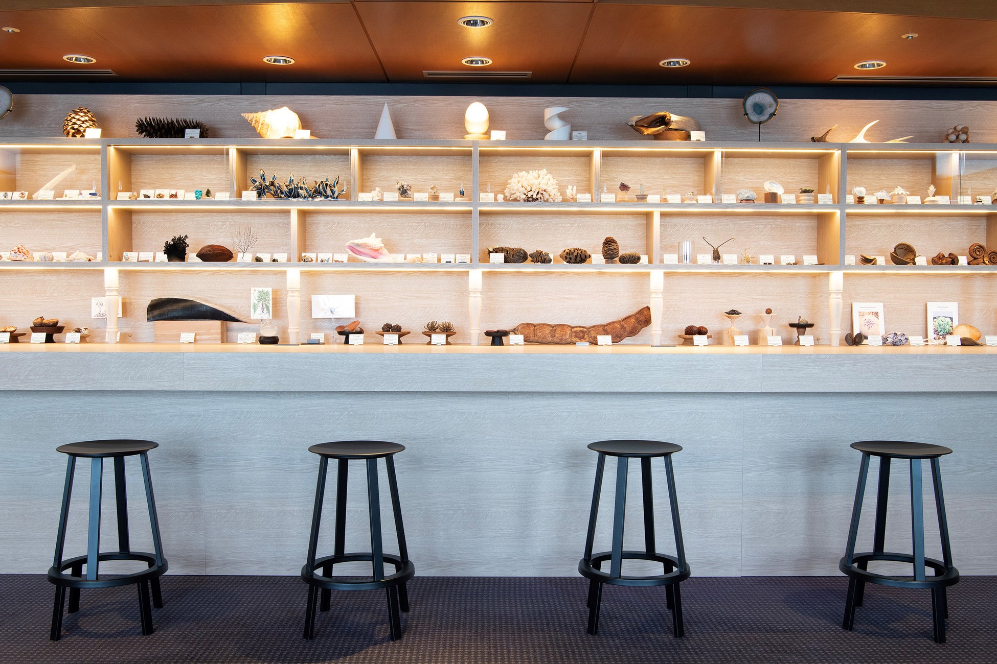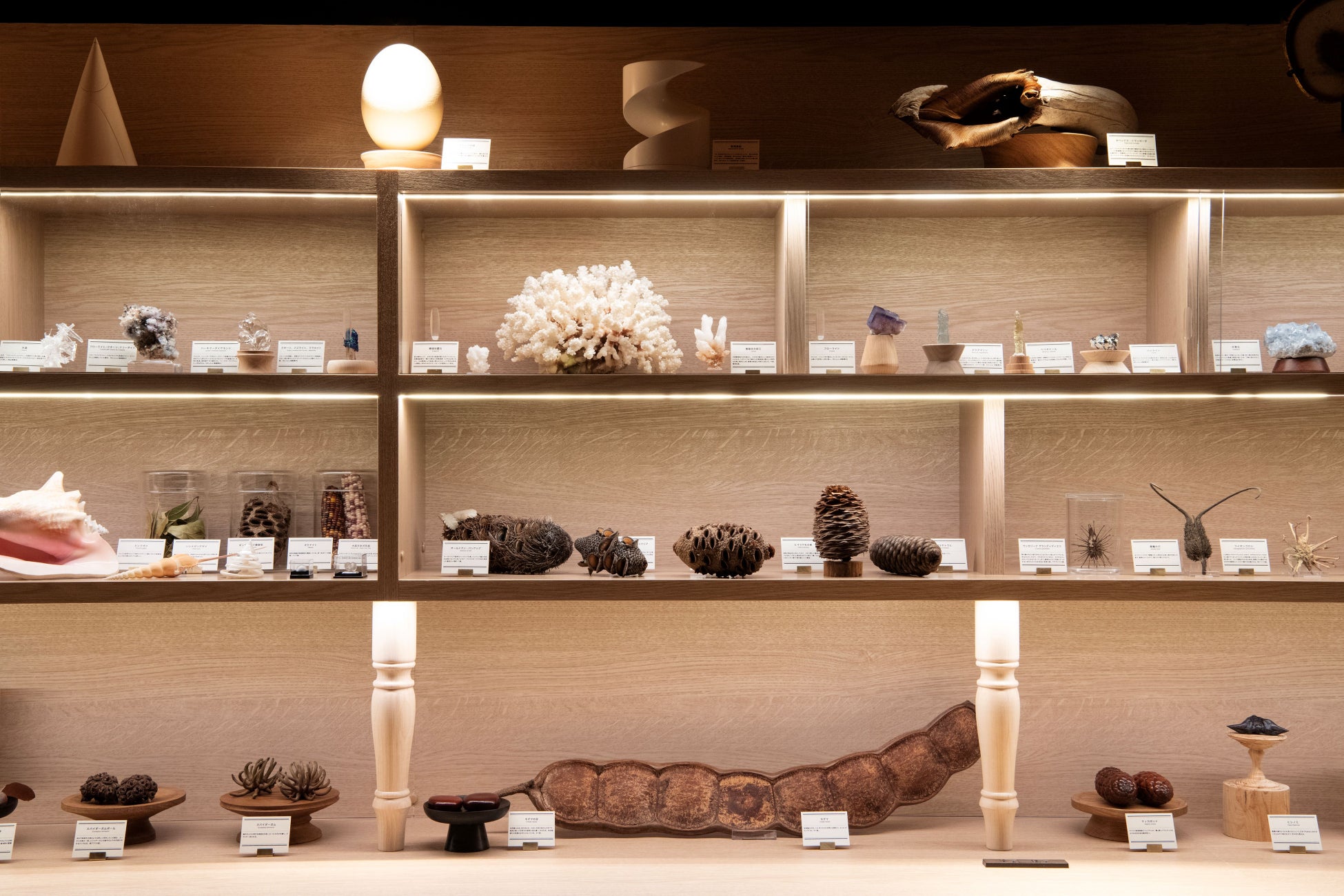 キャビネットには、文字が浮き出るように見える鉱物”ウレキサイト″やテクタイトと呼ばれる隕石に起因する天然ガラス″モルダバイト”、生息地では鏡のように周りの景色を身体に映し込んで姿を隠し、光学迷彩のような効果を得ている″プラチナコガネ”などを用意。植物、鉱物、貝類、魚類、昆虫など、約150点のさまざまなユニークな標本をディスプレイしています。それぞれの標本にはユニークな生態やそのバックグラウンドがわかる解説が書かれており、自然への好奇心をさらに掻き立ててくれます。