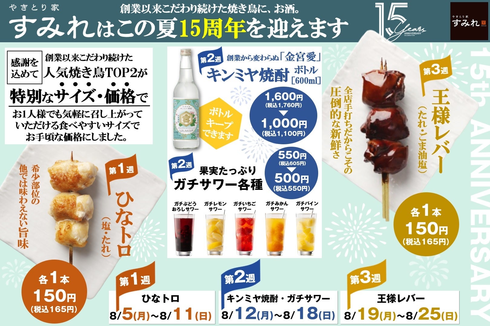 やきとり家すみれ 15周年記念!8月5日(月)から週替わりでキャンペーン実施。ひなトロと王様レバーが特別サイズでお手頃価格に!さらにキンミヤ焼酎もお得!