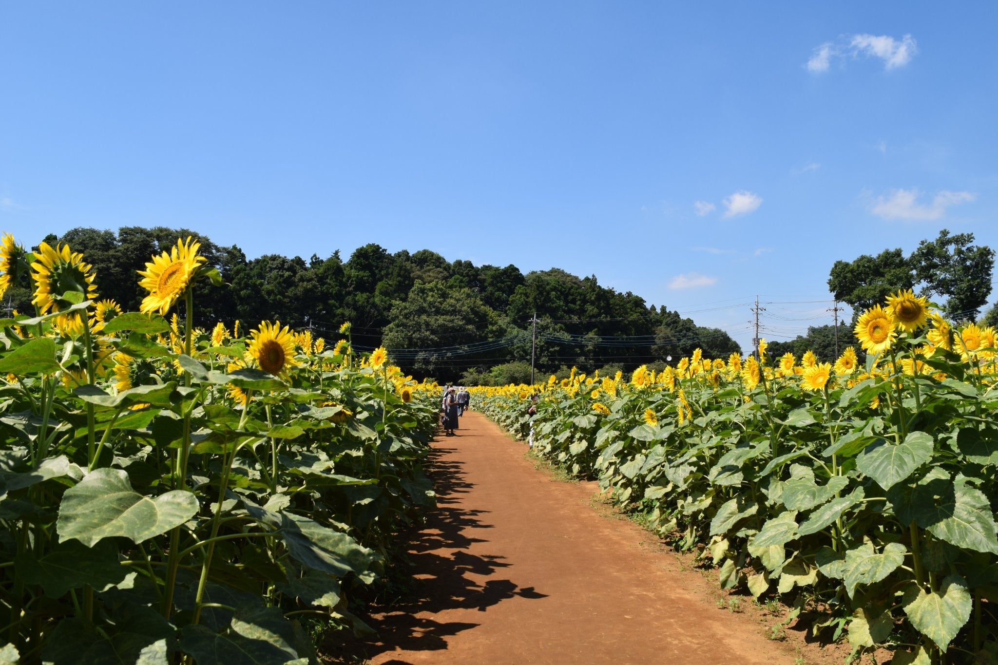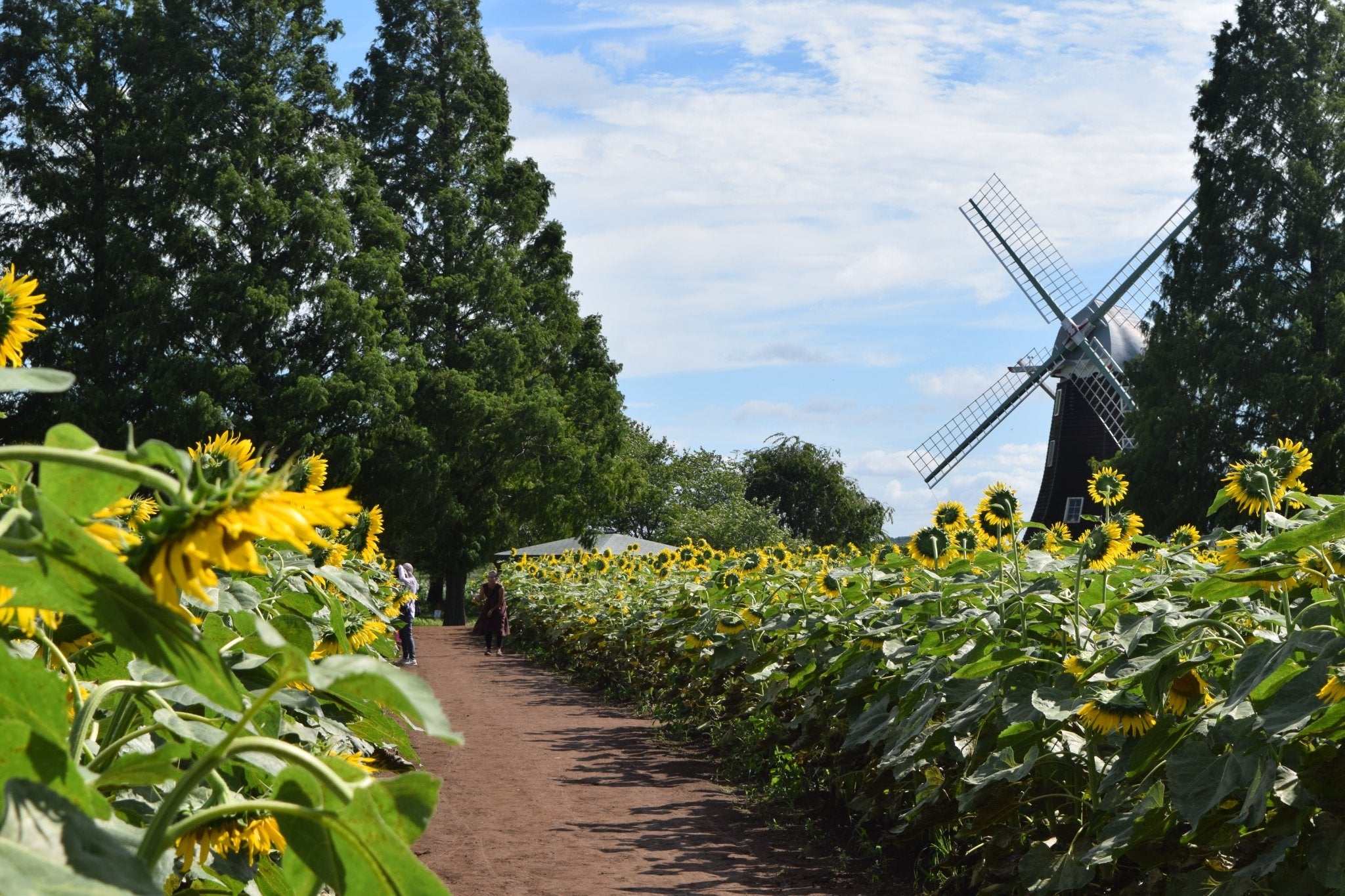 - 晴れた日には、青空とヒマワリの黄色のコントラストが美しい絶景が楽しめる風車前花畑